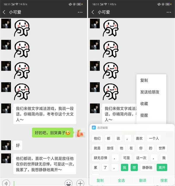朋友发过来的文字,长按内容,对内容进行快速编辑重组,同一段文字可以有多种呈现的方式,除了快速编辑,还可以快速搜索文本中内容。