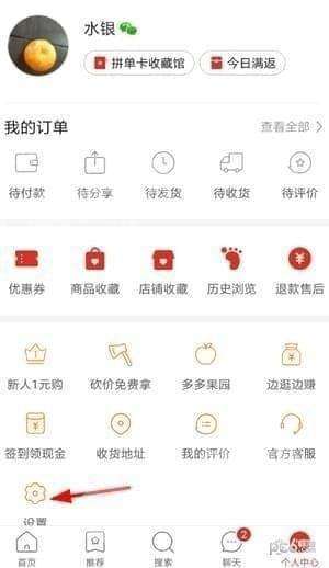 1、打开拼多多App,进入个人中心页面点击“设置”;。